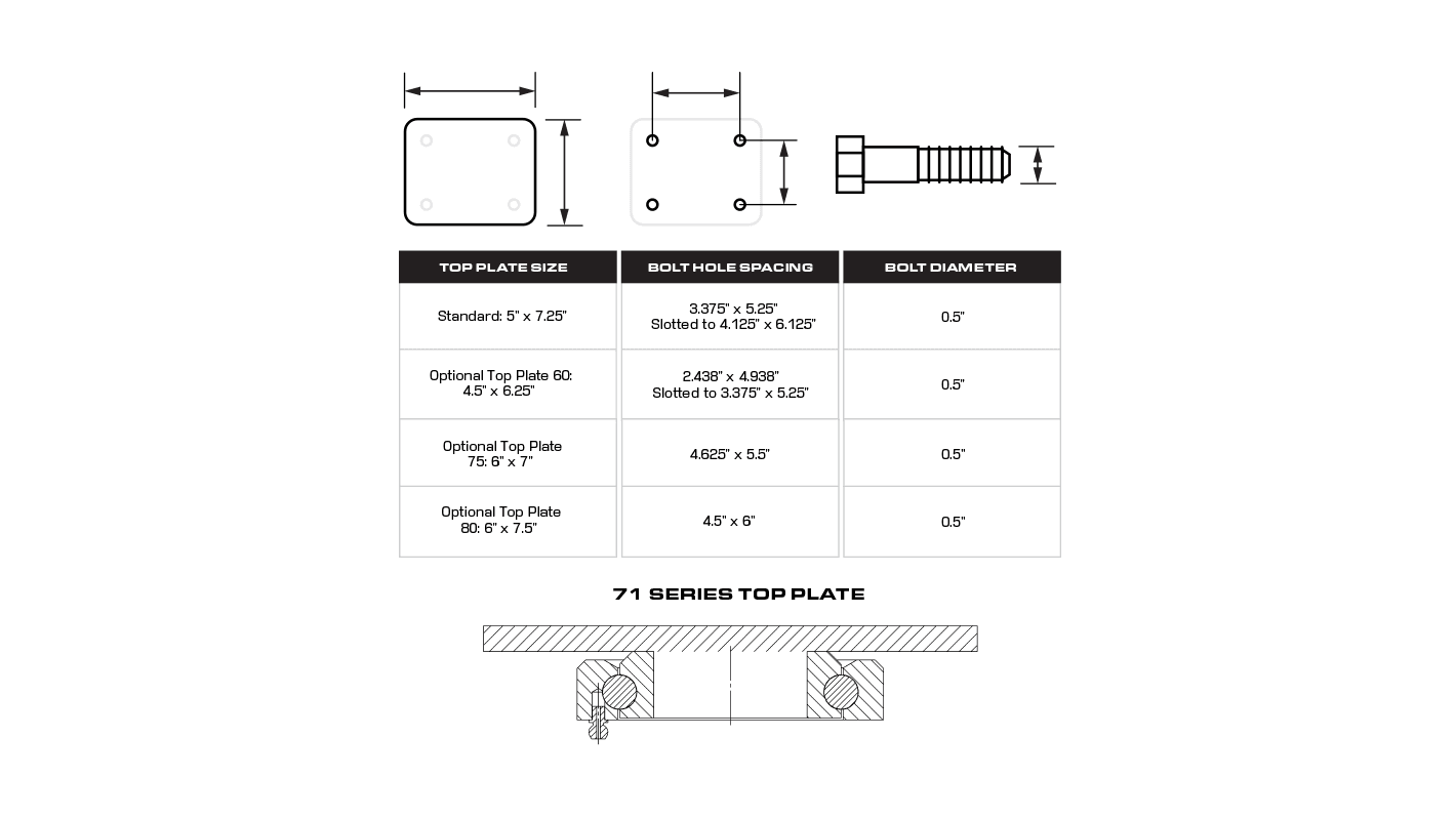 Suited for medium duty towing applications where shock loads are present. In addition, they may be used for dough troughs, high capacity die tables, machinery dollies, corrugated steel box trucks, heavy portable storage racks, mobile military equipment, aircraft maintenance stands, and aircraft crew stairs.