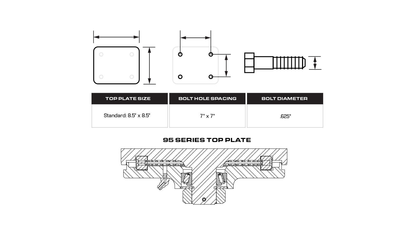 Swivel Section: Constructed of hot forged C-1045 steel with a 7” diameter raceway featuring straight roller bearings and a tapered thrust bearing.