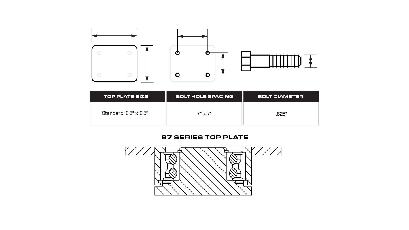 Legs: 1/2” x 4” steel, formed and continuously welded on the inside and outside to the yoke base.